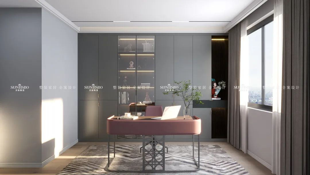 哑灰的定制书柜,冷静理性,带来思绪上井然有序的细密逻辑。天然原生的光感,让视觉达到完美平衡。书房特意配上多裂绿植,让现代简约与传统文化结合,萌发出别出心裁的设计,展现业主对传统文化情结的喜爱。
